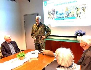 Porin prikaatin komentaja, prikaatikenraali Jami Virta otti ryhmämme vastaan varuskuntaravintola Rumpalipojan kabinetissa. Hän kertoi prikaatin historiasta ja nykypäivästä. Joukko-osaston perusti 16.2.1626 Ruotsin kuningas Kustaa II Adolf. Aikojen saatossa eri nimillä varustettu Porin prikaati täyttää siis ensi vuonna 400 vuotta. Nykyisin Säkylän varuskuntaan kuuluvat ilmatorjuntaa lukuunottamatta kaikki maavoimien aselajit. Säkylässsä koulutetaan nykyisin myös sotilaita kriisinhallintatehtäviin ympäri maailman.